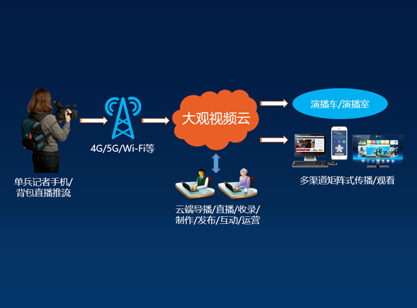X-Studio单兵记者依托云端演播能力,可以敏捷高效地深入新闻前线。记者利用手机或背包等单兵便携装备,通过4G/5G/Wi-Fi网络,将现场实时影像传送上云,或与演播室进行视音频直播连线。