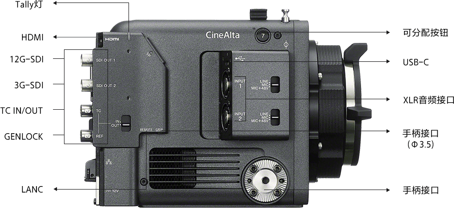 根据广大影视制作者的反馈,CineAltaB 改进了机身按钮的布局设计。例如,所有菜单按钮都位于摄像师的同一侧,并且在三个位置设计了 Tally 录制灯,方便周围的工作人员检查拍摄状态。此外,新的 3.5 英寸多功能液晶显示屏还支持取景、触摸对焦和菜单控制等功能。CineAltaB 配备了可选的T形竖拍手柄,可在肩扛模式下操控摄影机,而且握持也很舒适。